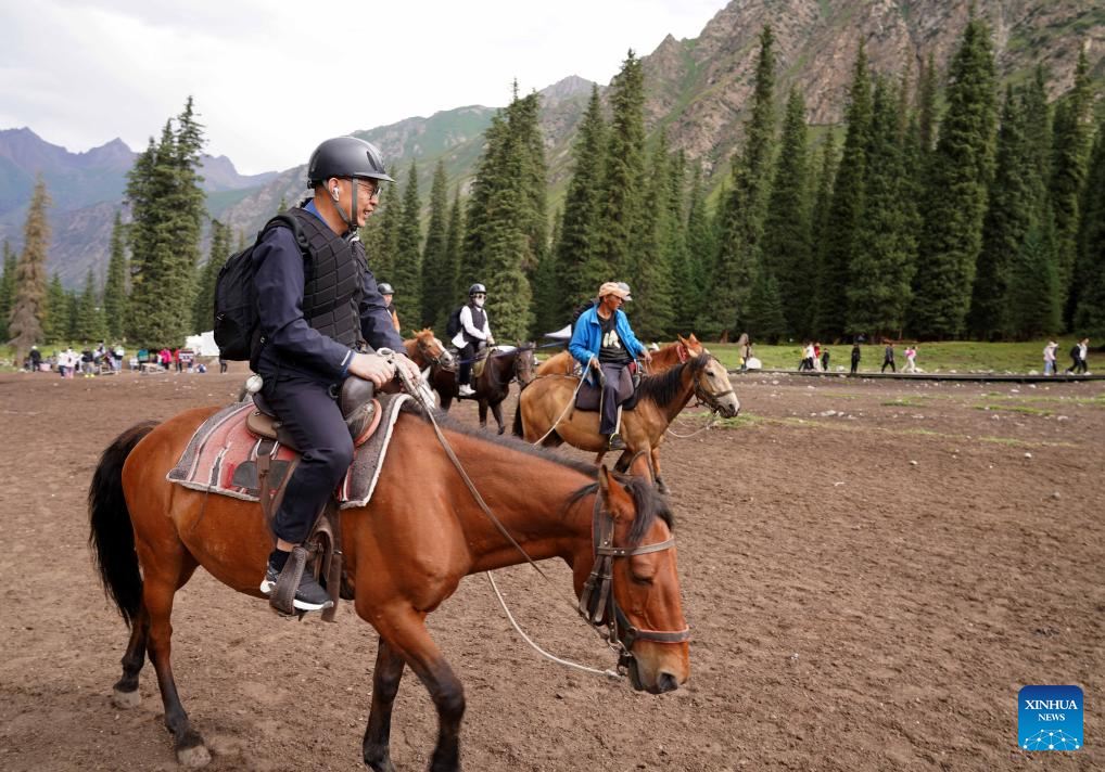 Tourists ride horses at a scenic area in Gongliu County of Ili Kazak Autonomous Prefecture, northwest China's Xinjiang Uygur Autonomous Region, Aug. 2, 2025. Ili Kazak Autonomous Prefecture has ushered in its peak tourism period. The region's unique natural landscapes and cultural sites have attracted a large number of visitors. It received 54.93 million domestic tourists in the first seven months of this year, a year-on-year increase of 10.31 percent. (Xinhua/Liu Lianfen)