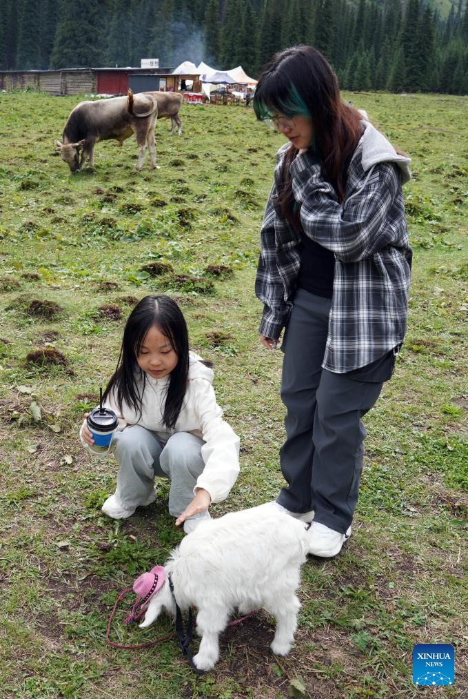 A child pets a cub at Xiata scenic area in Zhaosu County of Ili Kazak Autonomous Prefecture, northwest China's Xinjiang Uygur Autonomous Region, July 30, 2025. Ili Kazak Autonomous Prefecture has ushered in its peak tourism period. The region's unique natural landscapes and cultural sites have attracted a large number of visitors. It received 54.93 million domestic tourists in the first seven months of this year, a year-on-year increase of 10.31 percent. (Xinhua/Liu Lianfen)