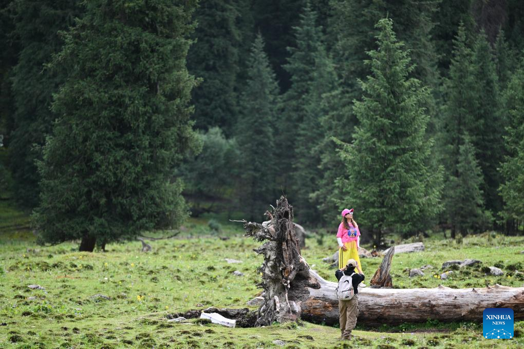 Tourists take photos at Xiata scenic area in Zhaosu County of Ili Kazak Autonomous Prefecture, northwest China's Xinjiang Uygur Autonomous Region, July 30, 2025. Ili Kazak Autonomous Prefecture has ushered in its peak tourism period. The region's unique natural landscapes and cultural sites have attracted a large number of visitors. It received 54.93 million domestic tourists in the first seven months of this year, a year-on-year increase of 10.31 percent. (Xinhua/Xin Yuewei)