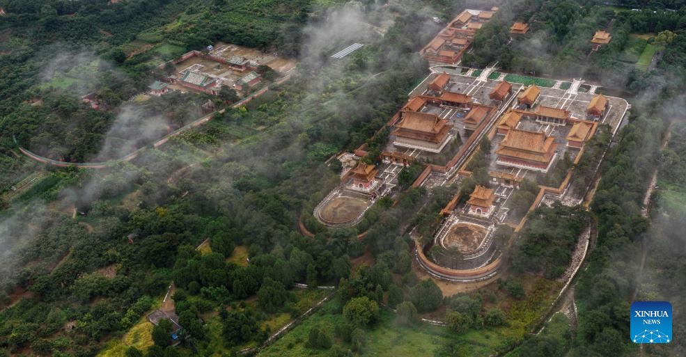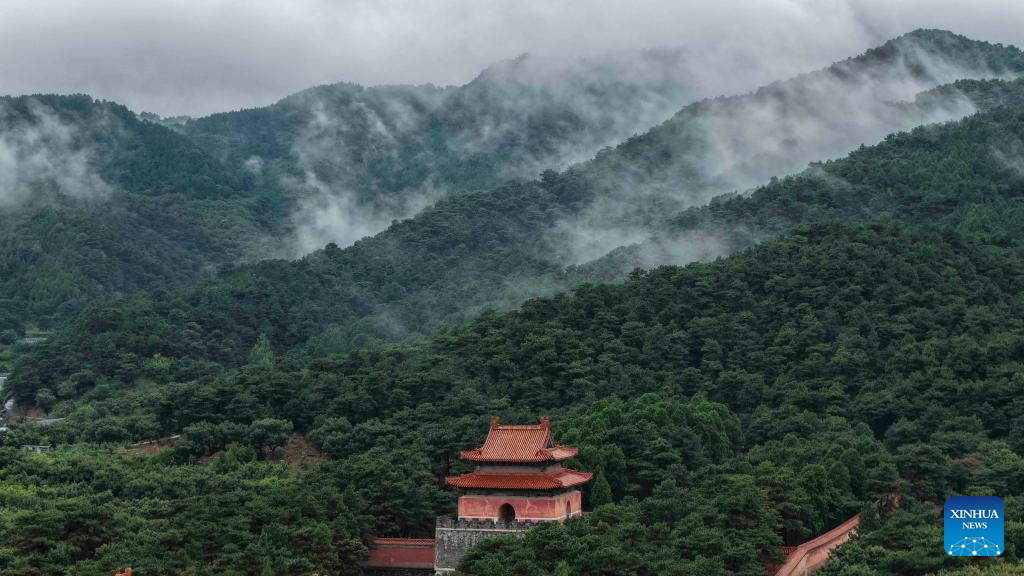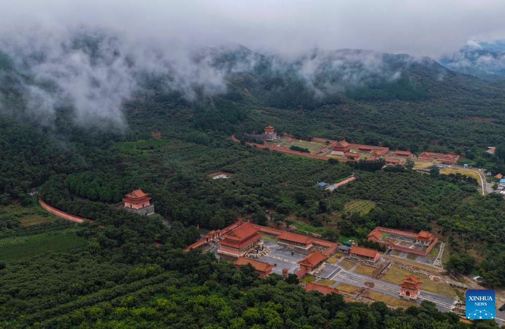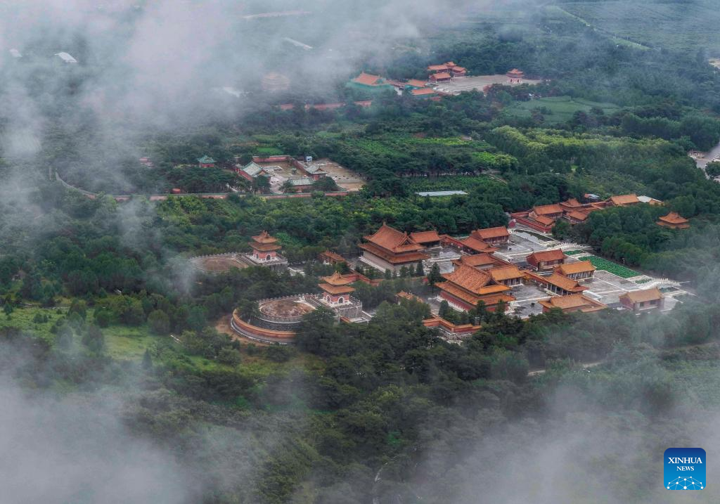 An aerial drone photo taken on Aug. 5, 2025 shows the scenery of mist-shrouded eastern royal tombs of the Qing Dynasty (1644-1911) in Zunhua City, north China's Hebei Province. (Photo by Liu Mancang/Xinhua)