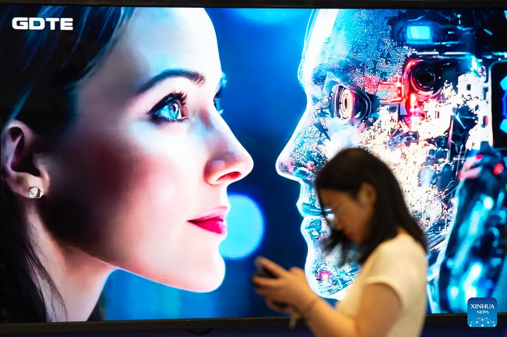 A visitor walks past a screen during the Digital Transformation Indonesia Conference and Expo 2025 in Jakarta, Indonesia, Aug. 6, 2025. Scheduled from August 6 to 7, the event features a conference and an expo showcasing innovative technologies in cyber security, artificial intelligence, network infrastructure, etc. (Xinhua/Veri Sanovri)