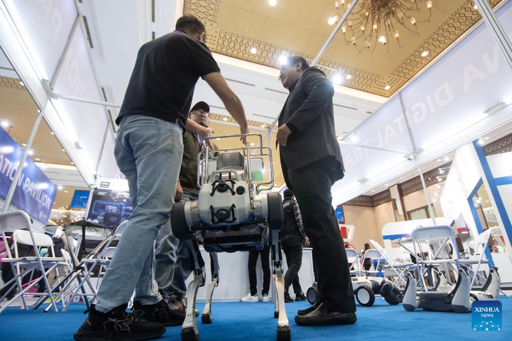 A robotic dog is seen during the Digital Transformation Indonesia Conference and Expo 2025 in Jakarta, Indonesia, Aug. 6, 2025. Scheduled from August 6 to 7, the event features a conference and an expo showcasing innovative technologies in cyber security, artificial intelligence, network infrastructure, etc. (Xinhua/Veri Sanovri)