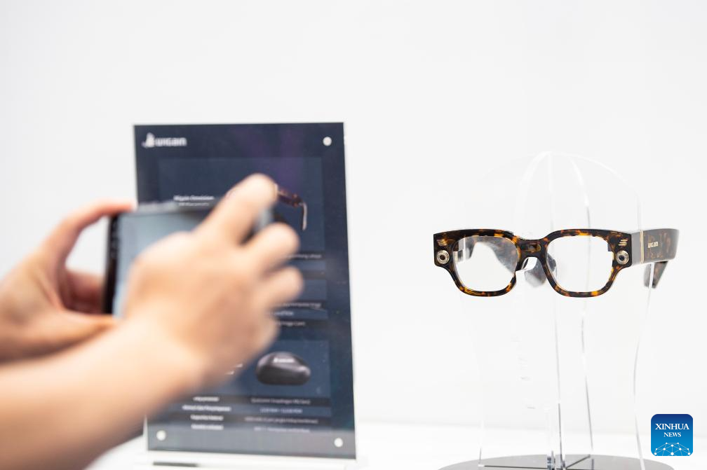 A visitor takes photos of a pair of glasses powered by AI technology during the Digital Transformation Indonesia Conference and Expo 2025 in Jakarta, Indonesia, Aug. 6, 2025. Scheduled from August 6 to 7, the event features a conference and an expo showcasing innovative technologies in cyber security, artificial intelligence, network infrastructure, etc. (Xinhua/Veri Sanovri)