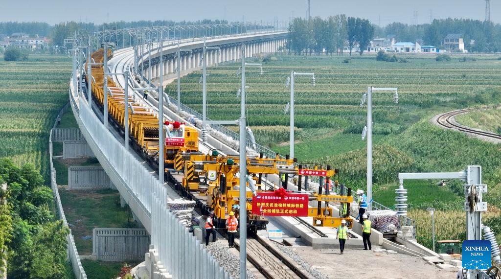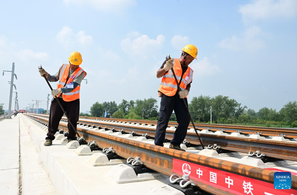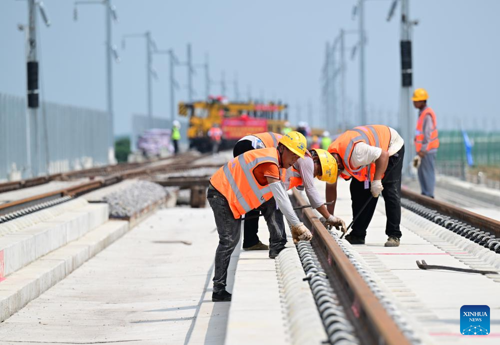 Workers work at the track laying construction site of an intercity railway in east China's Anhui Province, Aug 6, 2025. The first section of the track, a part of the intercity railway linking Huaibei, Suzhou and Bengbu City in Anhui Province, started track-laying work on Wednesday. (Xinhua/Zhou Mu)
