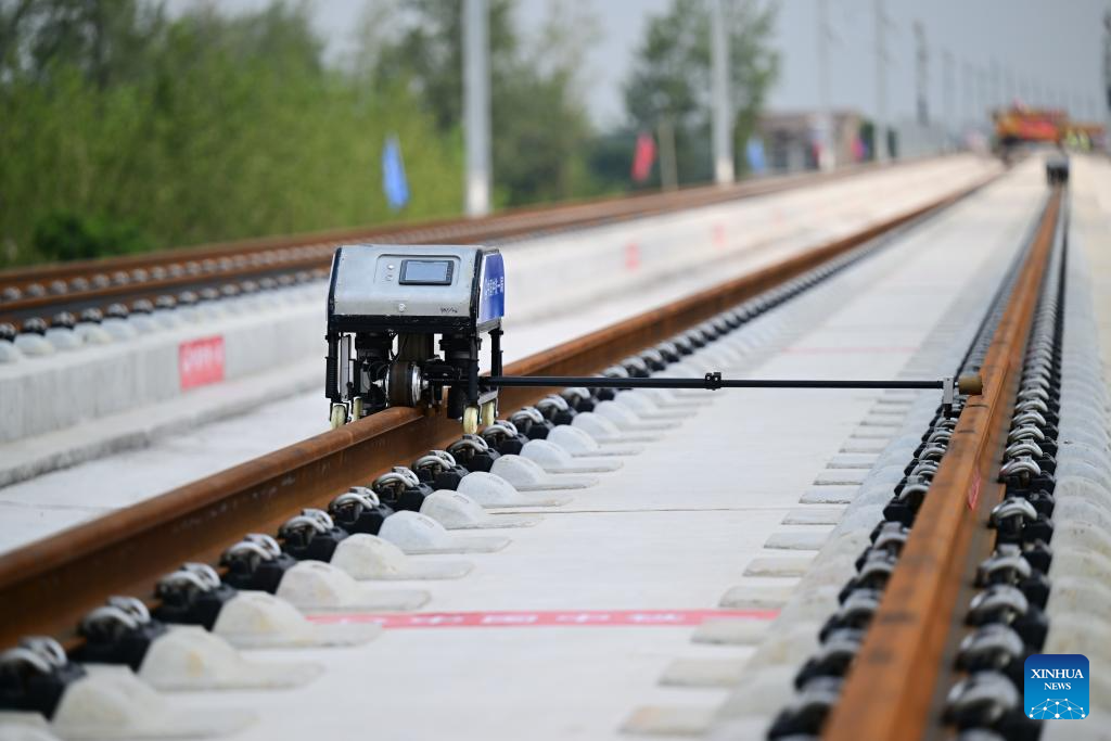 A smart bolt fastening machine works at the track laying construction site of an intercity railway in east China's Anhui Province, Aug 6, 2025. The first section of the track, a part of the intercity railway linking Huaibei, Suzhou and Bengbu City in Anhui Province, started track-laying work on Wednesday. (Xinhua/Zhou Mu)