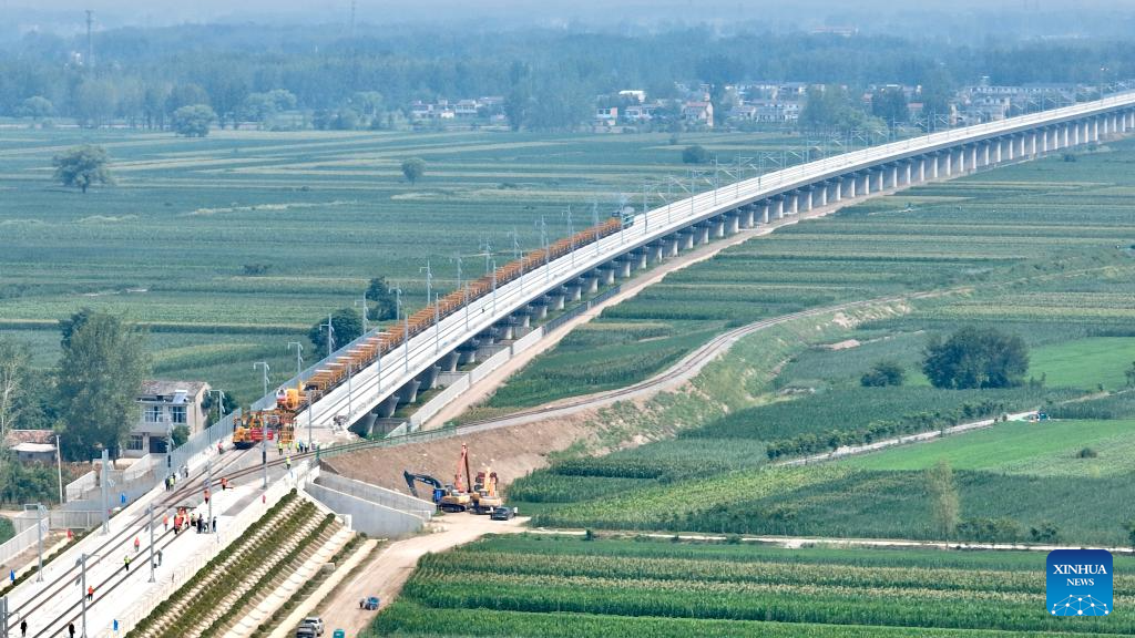 An aerial drone photo taken on Aug. 6, 2025 shows the track laying construction site of an intercity railway in east China's Anhui Province. The first section of the track, a part of the intercity railway linking Huaibei, Suzhou and Bengbu City in Anhui Province, started track-laying work on Wednesday. (Xinhua/Zhou Mu)