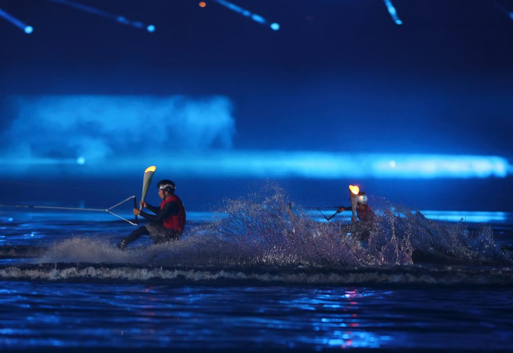 For the first time in the World Games history, a cauldron tower was set on Qinhuang Lake. Two wave-making boats raced across the lake, pulling two water skiers to light the cauldron.