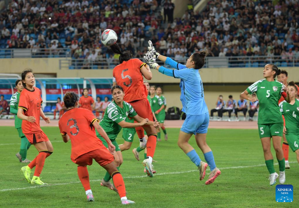 Liu Chen (R, top), goalkeeper of China, makes a save during the Group E football match between China and Syria at the AFC U20 Women's Asian Cup Qualifiers in Yinchuan, northwest China's Ningxia Hui Autonomous Region, Aug. 6, 2025. (Photo by Gao Xiaogang/Xinhua)