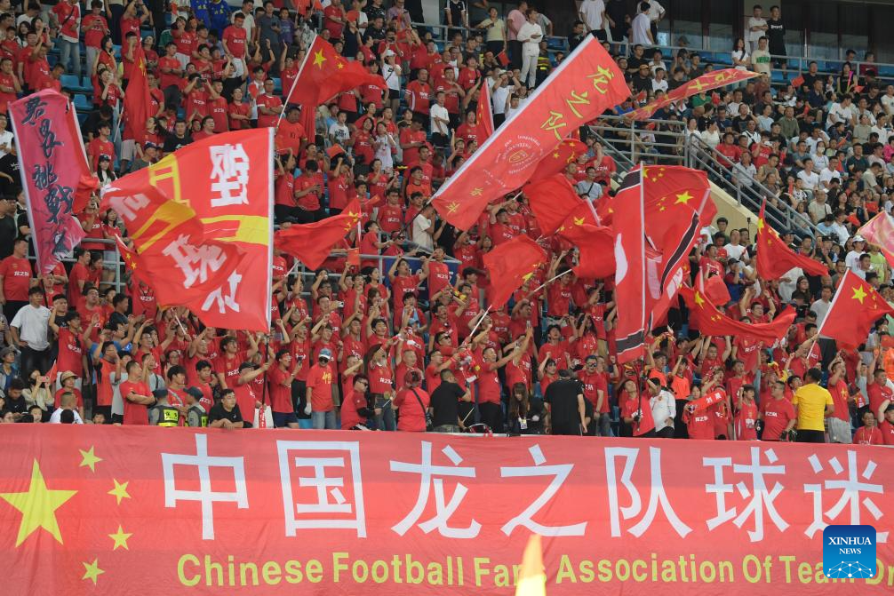 Supporters of team China celebrate a goal during the Group E football match between China and Syria at the AFC U20 Women's Asian Cup Qualifiers in Yinchuan, northwest China's Ningxia Hui Autonomous Region, Aug. 6, 2025. (Photo by Gao Xiaogang/Xinhua)