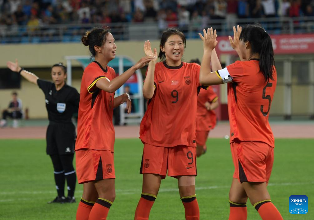 Li Ke (L), Liu Jiayu (C) and Huang Jiaxin of China celebrate a goal during the Group E football match between China and Syria at the AFC U20 Women's Asian Cup Qualifiers in Yinchuan, northwest China's Ningxia Hui Autonomous Region, Aug. 6, 2025. (Photo by Gao Xiaogang/Xinhua)