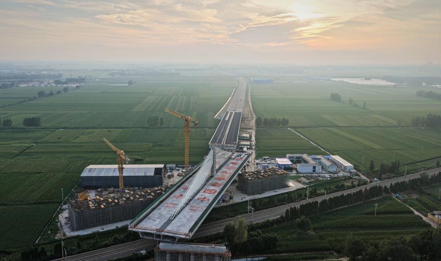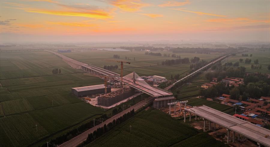 DEZHOU, Aug. 7 (Xinhua) -- A 23,500 tonnes cable-stayed bridge, part of the highway linking Dezhou of east China's Shandong Province and Shangrao of east China's Jiangxi Province, was rotated to its target position on Wednesday.