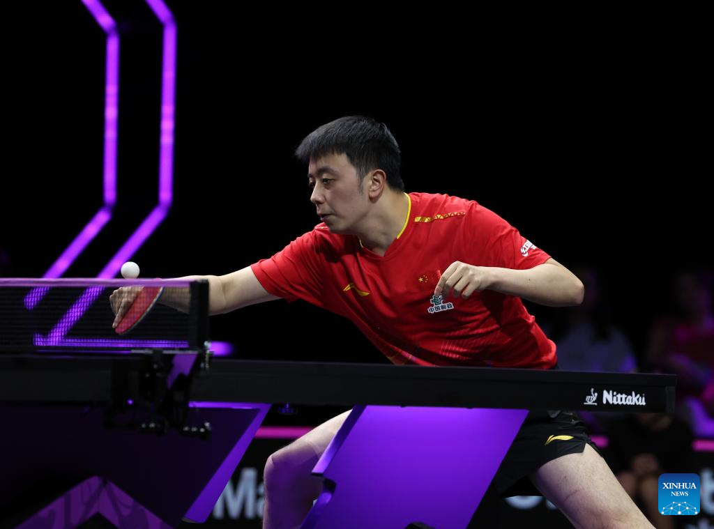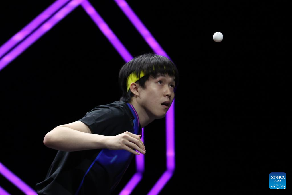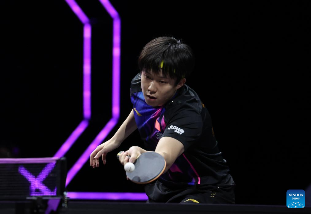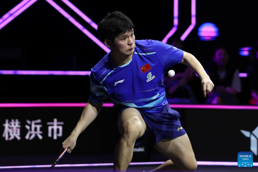 Wang Chuqin of China hits a return during the men's singles round of 32 match between Wang Chuqin of China and Chen Yuanyu of China at the WTT Champions Yokohama 2025 in Yokohama, Japan, Aug. 7, 2025. (Xinhua/Yue Chenxing)