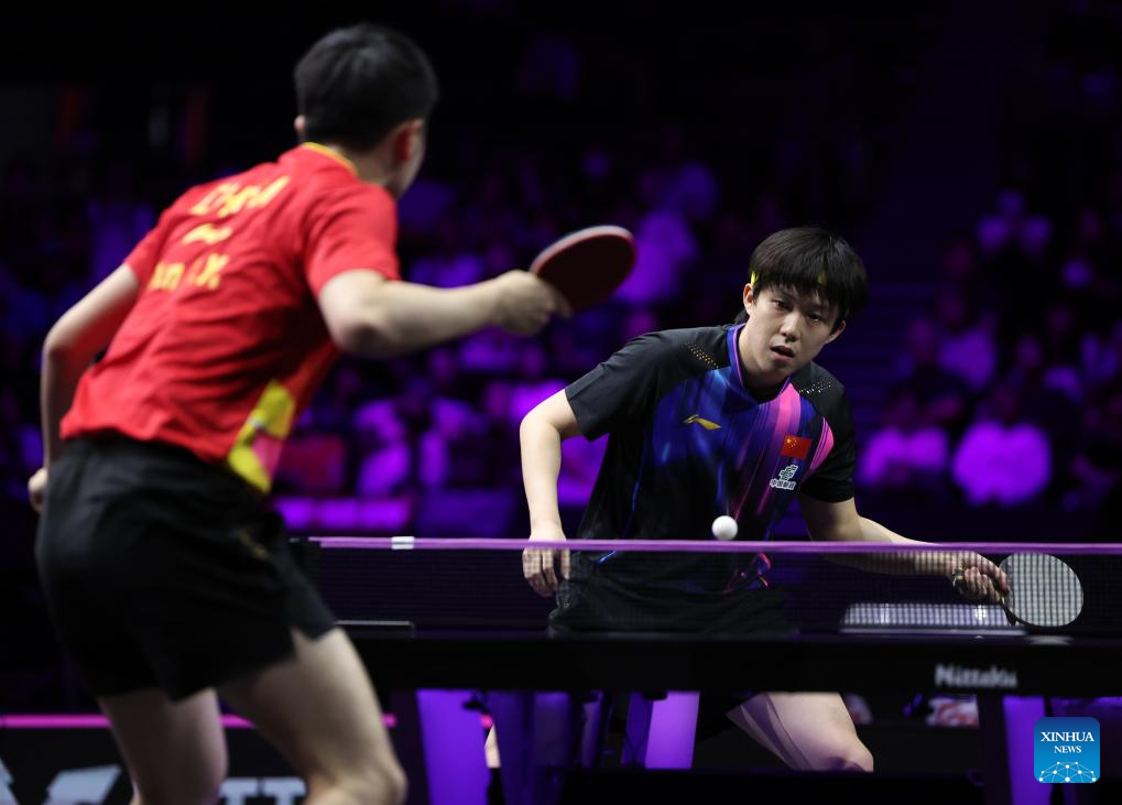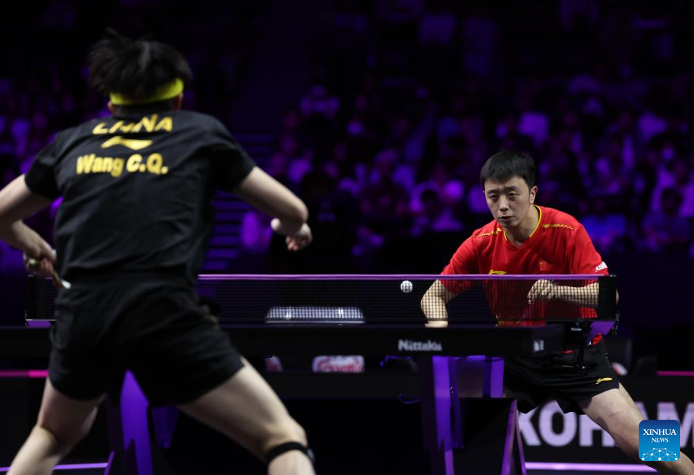 Wang Chuqin (R) of China returns the ball during the men's singles round of 32 match between Wang Chuqin of China and Chen Yuanyu of China at the WTT Champions Yokohama 2025 in Yokohama, Japan, Aug. 7, 2025. (Xinhua/Yue Chenxing)