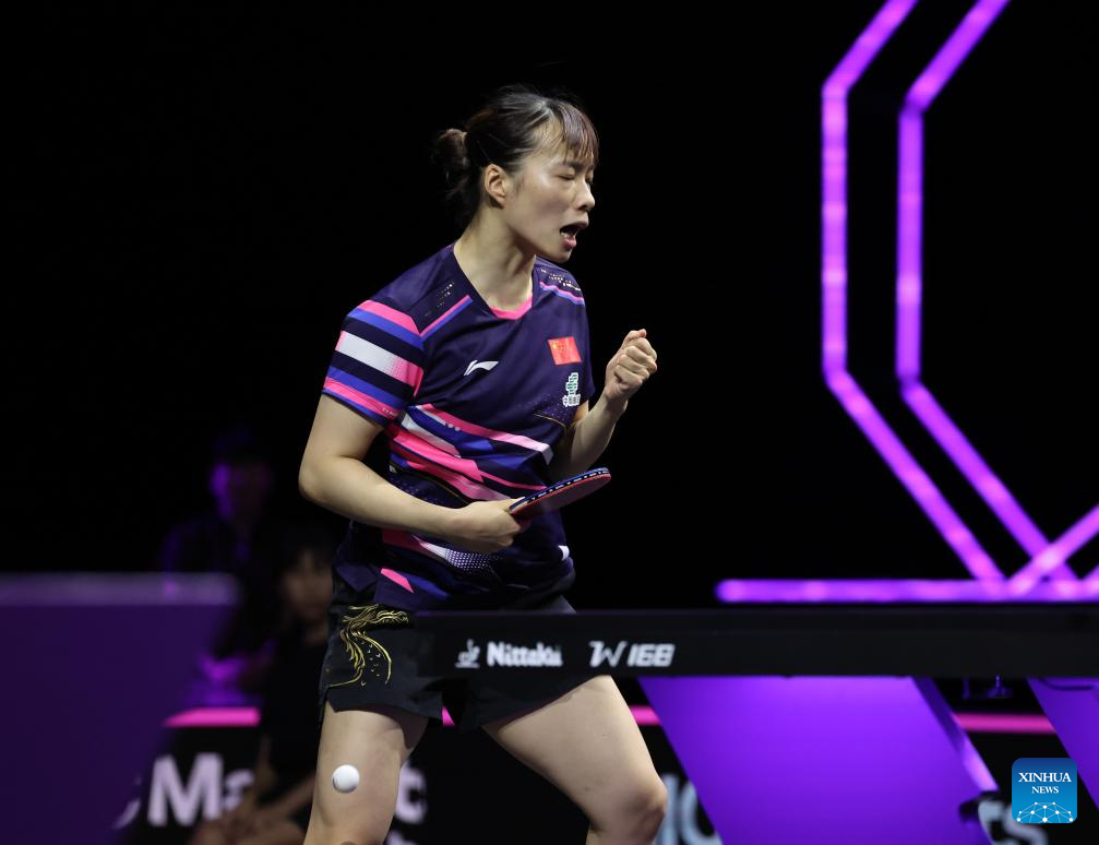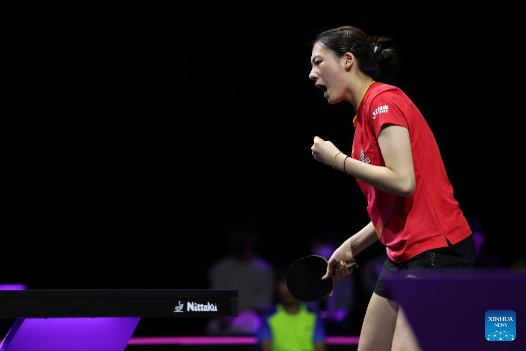 Shi Xunyao celebrates scoring during the women's singles round of 32 match between Shi Xunyao of China and Hana Goda of Egypt at the WTT Champions Yokohama 2025 in Yokohama, Japan, Aug. 7, 2025. (Xinhua/Yue Chenxing)