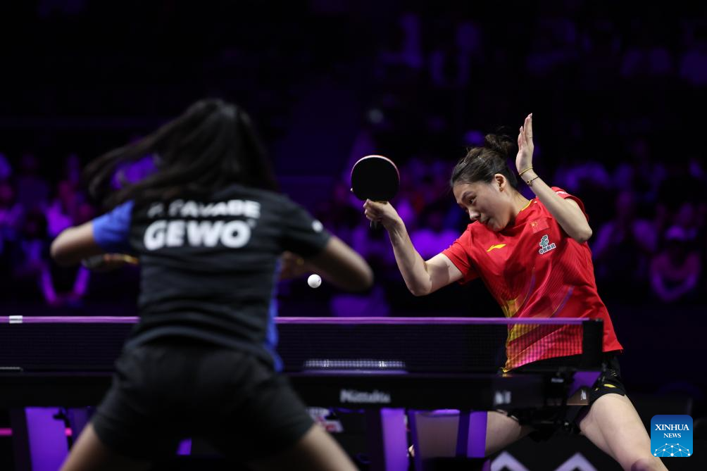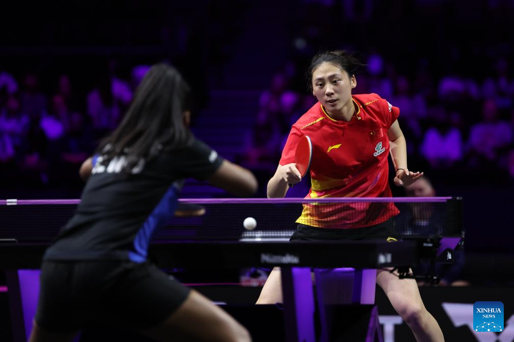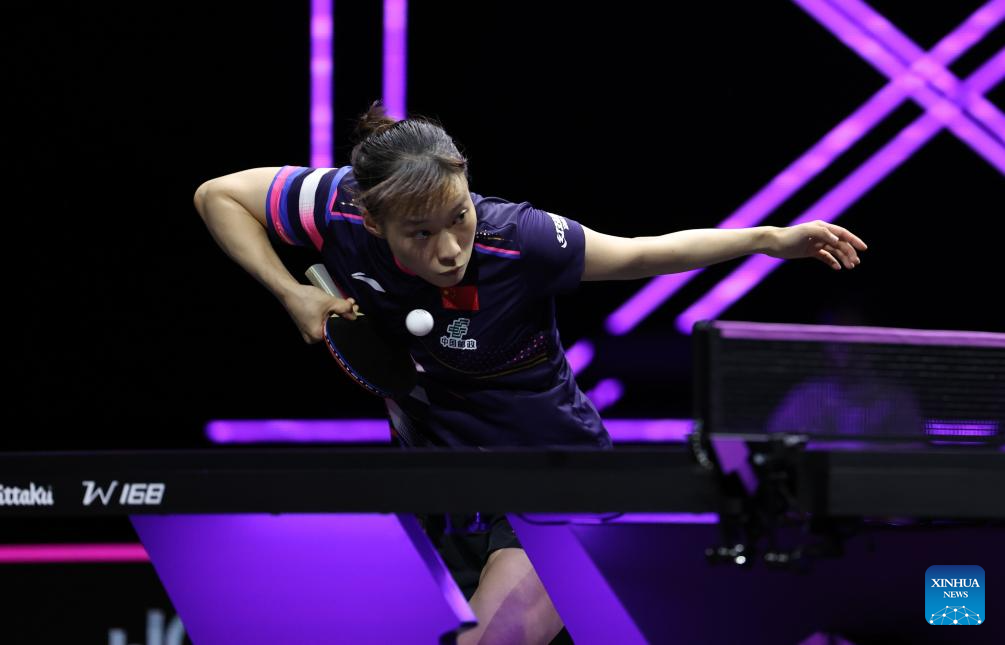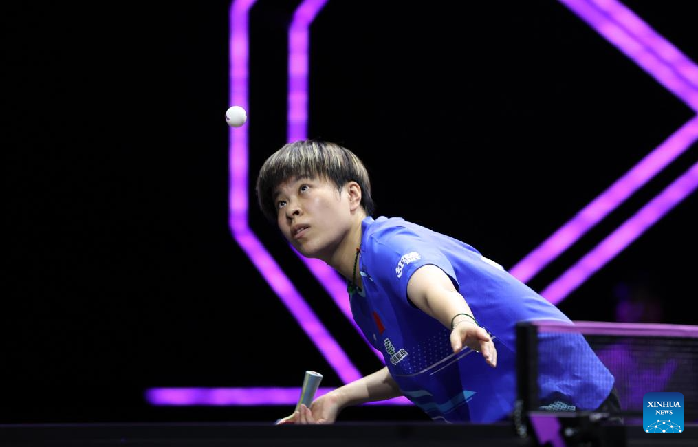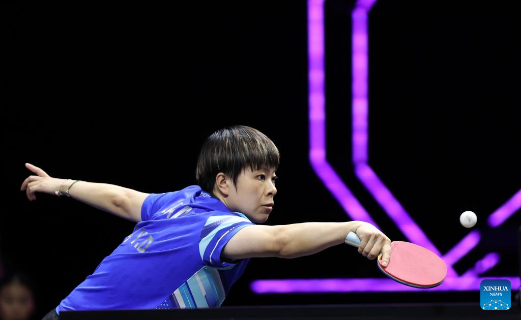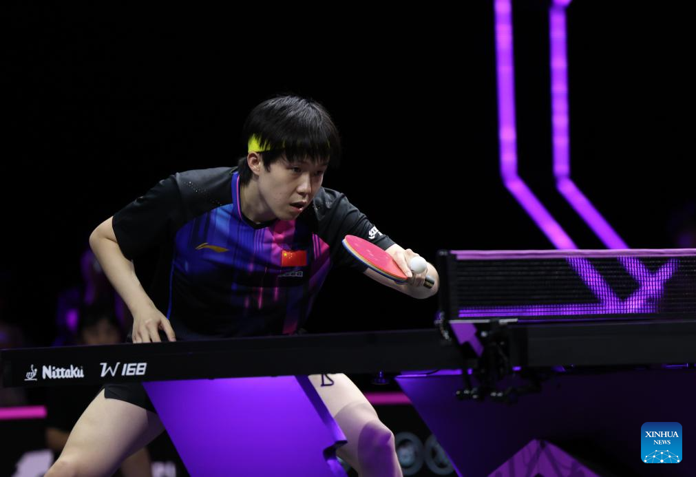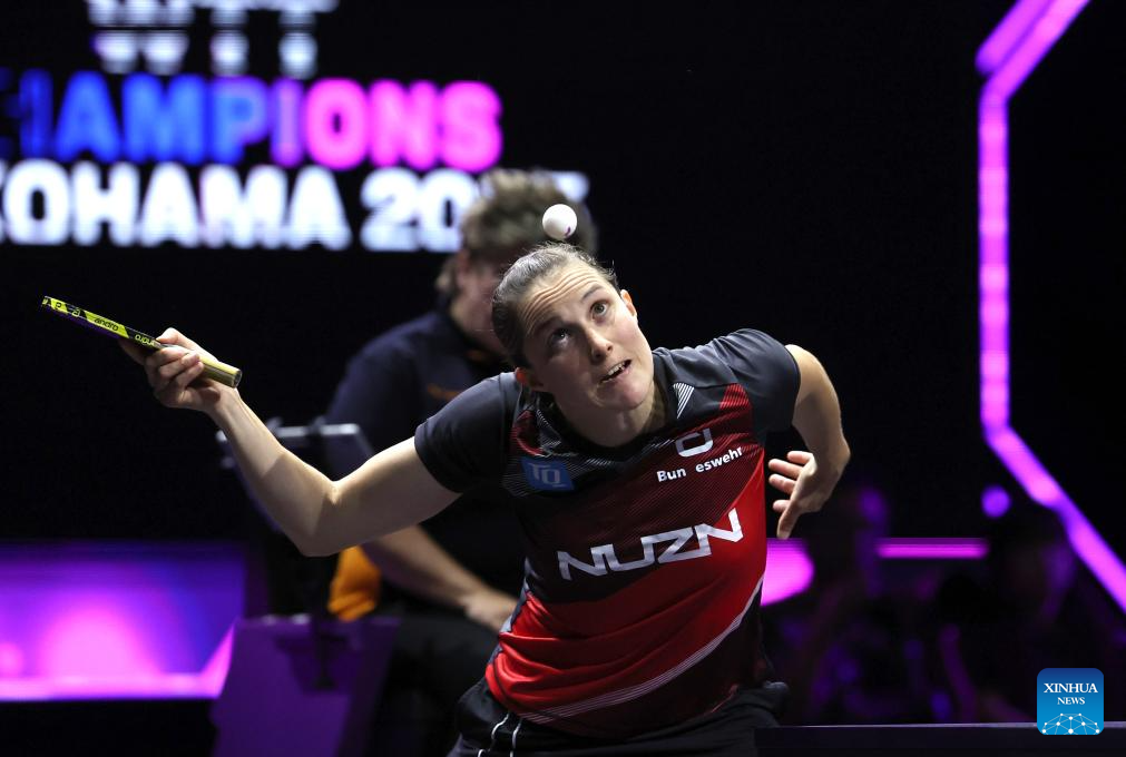 Wang Yidi returns the ball during the women's singles round of 32 match between Wang Yidi of China and Sabine Winter of Germany at the WTT Champions Yokohama 2025 in Yokohama, Japan, Aug. 7, 2025. (Xinhua/Yue Chenxing)
