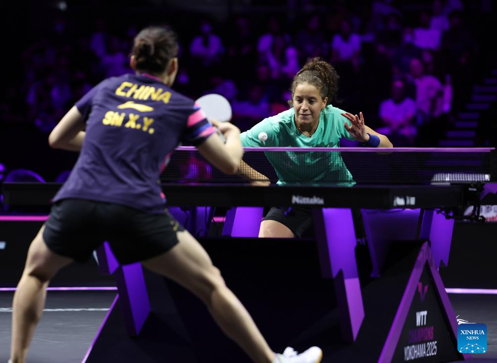 Hana Goda (R) returns the ball during the women's singles round of 32 match between Shi Xunyao of China and Hana Goda of Egypt at the WTT Champions Yokohama 2025 in Yokohama, Japan, Aug. 7, 2025. (Xinhua/Yue Chenxing)