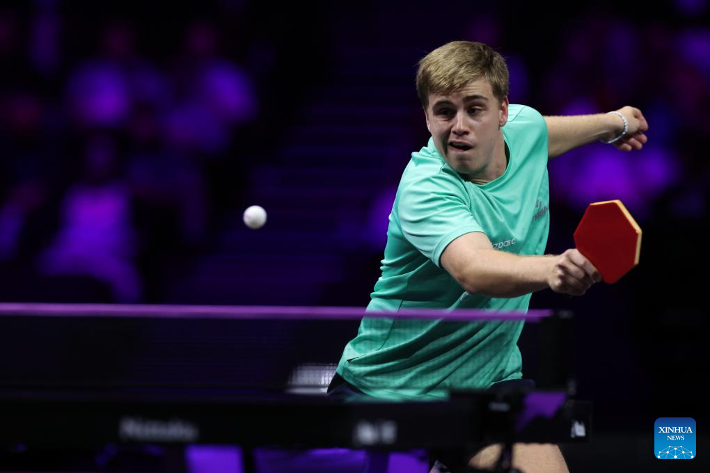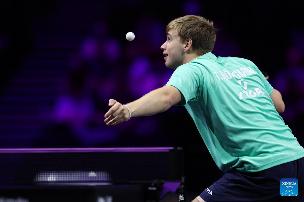 Truls Moregard of Sweden hits a return during the men's singles round of 32 match between Truls Moregard of Sweden and Quadri Aruna of Nigeria at the WTT Champions Yokohama 2025 in Yokohama, Japan, Aug. 7, 2025. (Xinhua/Yue Chenxing)