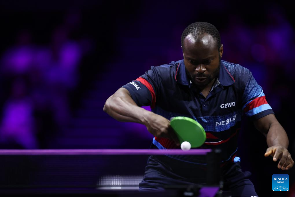 Quadri Aruna of Nigeria hits a return during the men's singles round of 32 match between Truls Moregard of Sweden and Quadri Aruna of Nigeria at the WTT Champions Yokohama 2025 in Yokohama, Japan, Aug. 7, 2025. (Xinhua/Yue Chenxing)