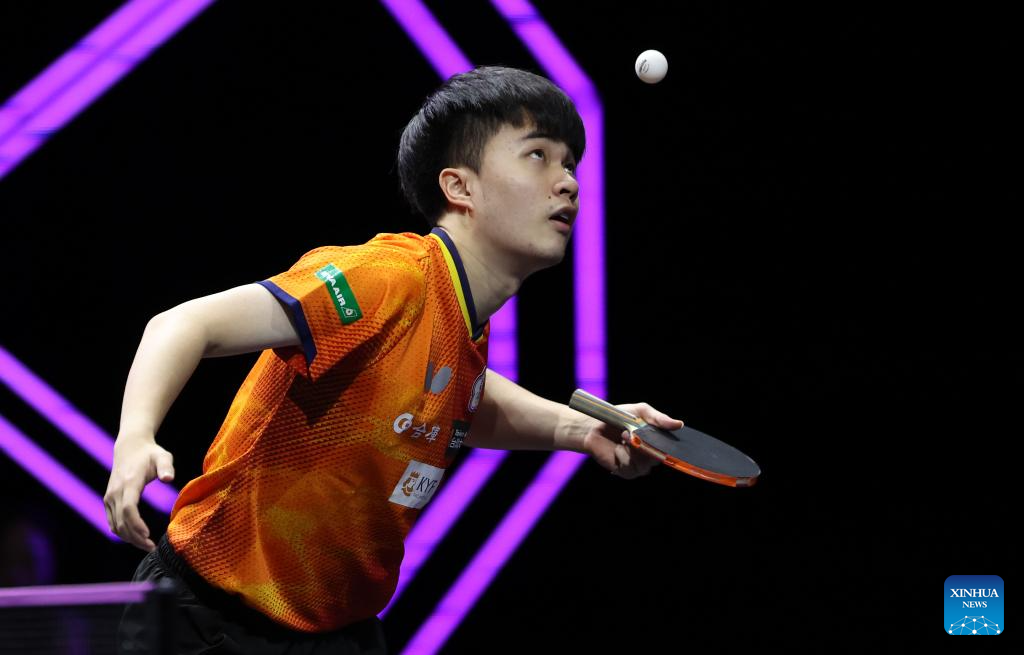 Lin Shidong hits a return during the men's singles round of 32 match between Lin Shidong of China and Lin Yun-Ju of Chinese Taipei at the WTT Champions Yokohama 2025 in Yokohama, Japan, Aug. 7, 2025. (Xinhua/Yue Chenxing)