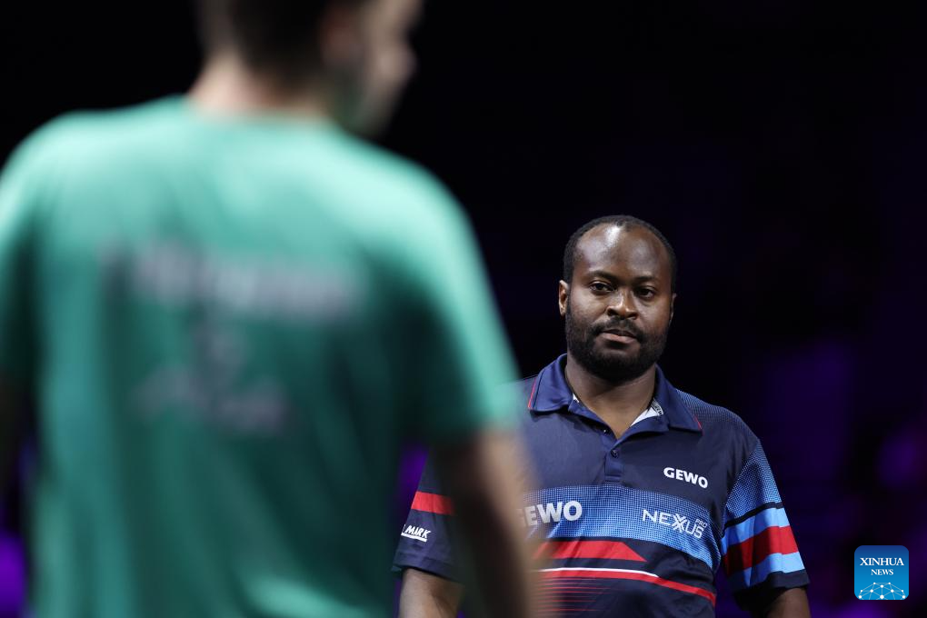 Quadri Aruna (R) of Nigeria reacts during the men's singles round of 32 match between Truls Moregard of Sweden and Quadri Aruna of Nigeria at the WTT Champions Yokohama 2025 in Yokohama, Japan, Aug. 7, 2025. (Xinhua/Yue Chenxing)