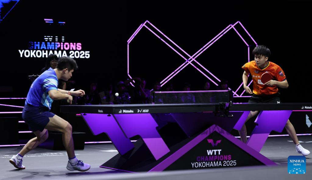 Chen Yuanyu (R) of China hits a return during the men's singles round of 32 match between Wang Chuqin of China and Chen Yuanyu of China at the WTT Champions Yokohama 2025 in Yokohama, Japan, Aug. 7, 2025. (Xinhua/Yue Chenxing)