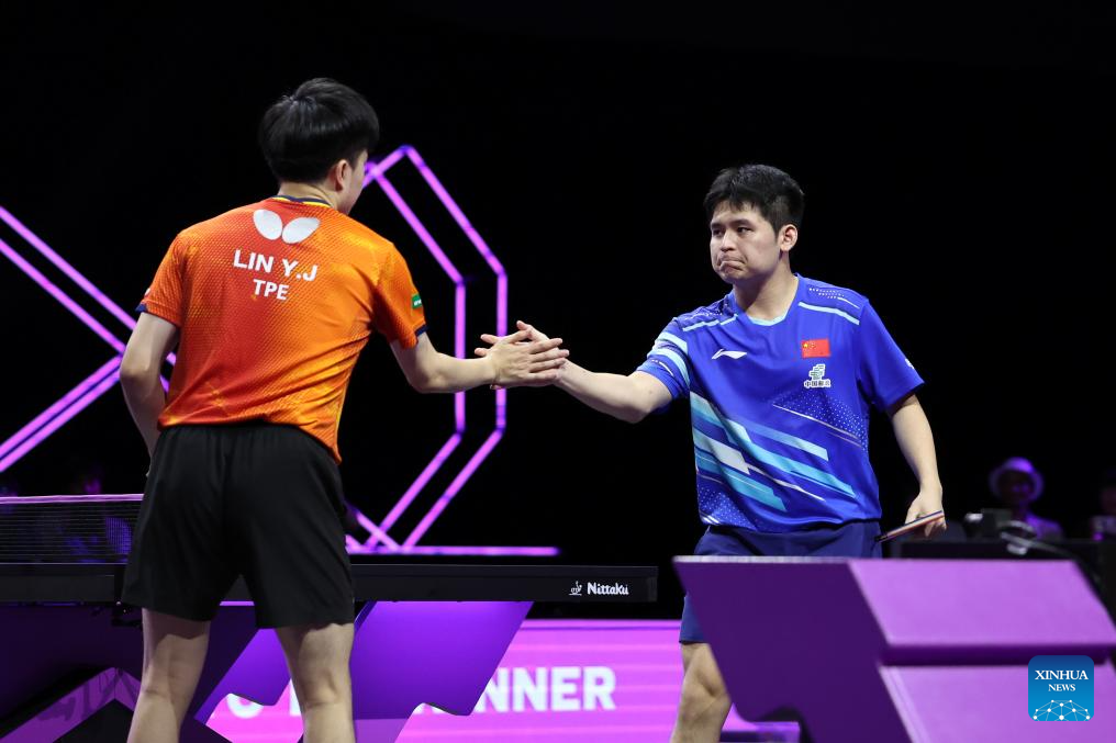 Lin Shidong (R) of China greets Lin Yun-Ju of Chinese Taipei after the men's singles round of 32 match at the WTT Champions Yokohama 2025 in Yokohama, Japan, Aug. 7, 2025. (Xinhua/Yue Chenxing)
