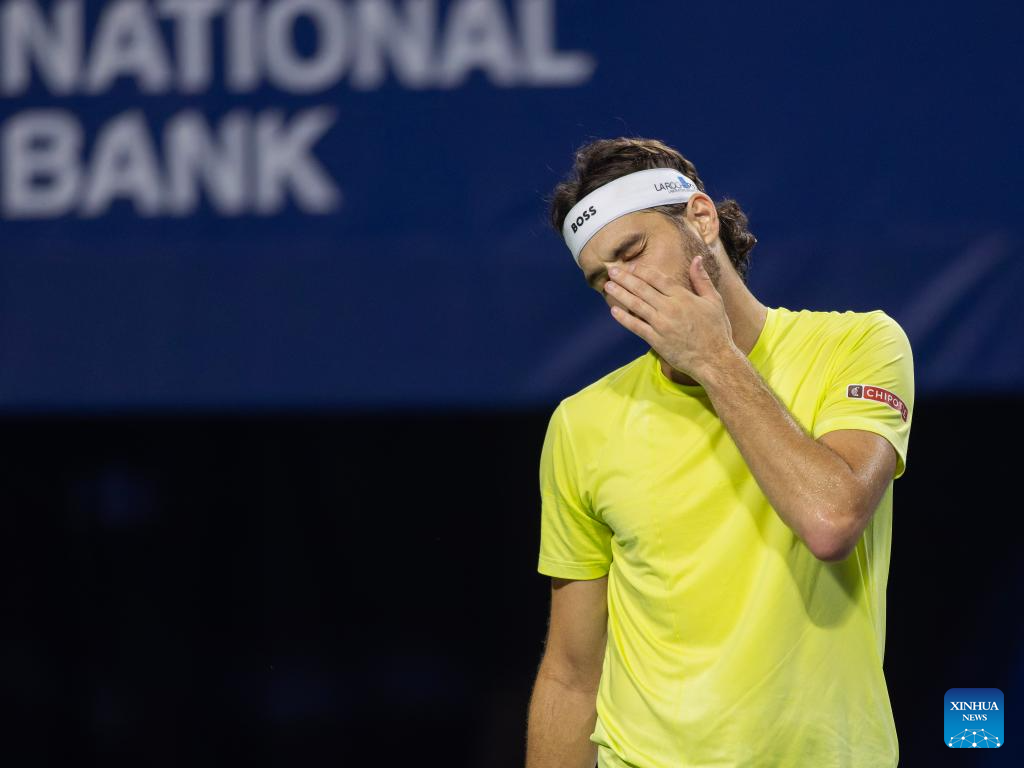 Taylor Fritz of the United States reacts during the men's singles semifinal match between Ben Shelton of the United States and Taylor Fritz of the United States at the 2025 National Bank Open tennis tournament in Toronto, Canada, on Aug. 6, 2025. (Photo by Zou Zheng/Xinhua)