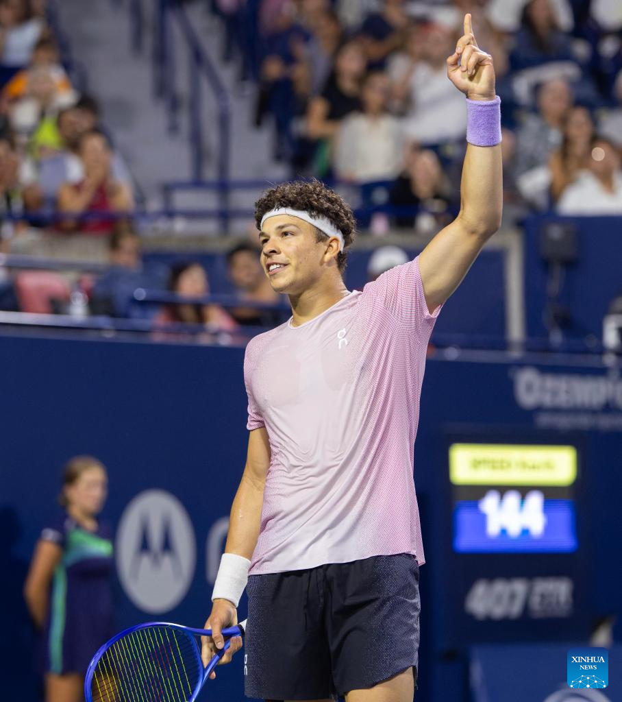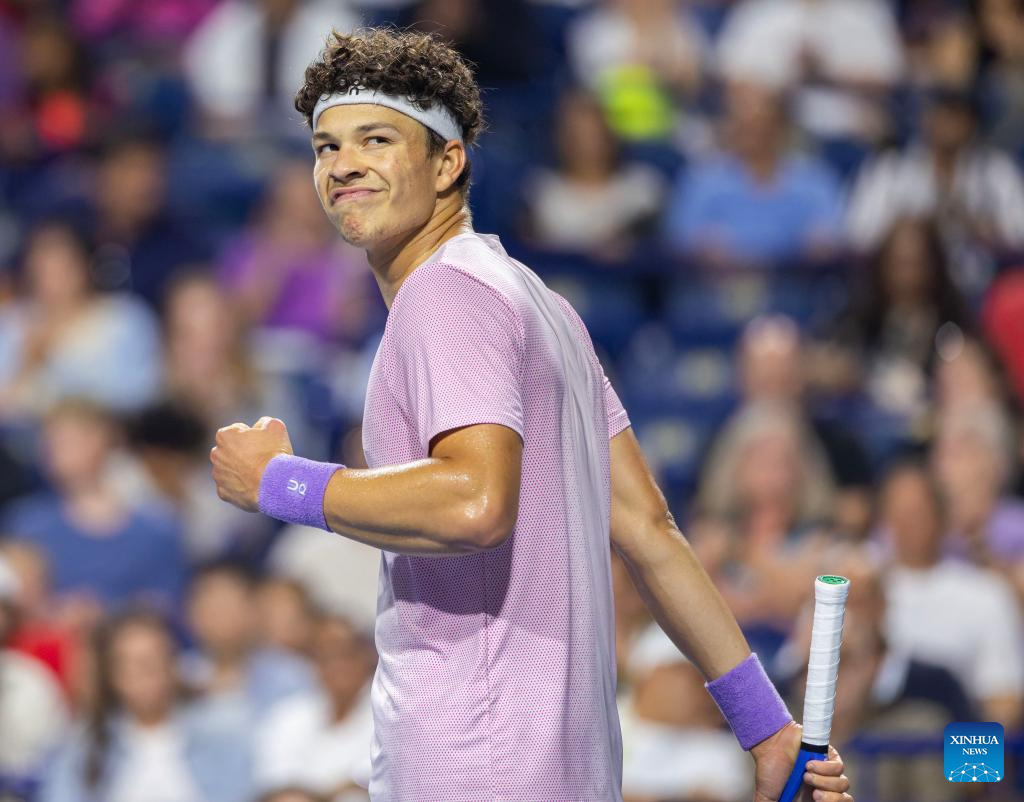 Ben Shelton of the United States celebrates victory after the men's singles semifinal match between Ben Shelton of the United States and Taylor Fritz of the United States at the 2025 National Bank Open tennis tournament in Toronto, Canada, on Aug. 6, 2025. (Photo by Zou Zheng/Xinhua)
