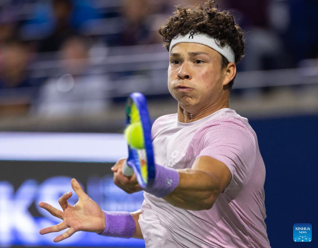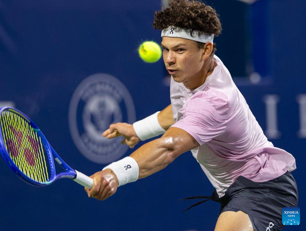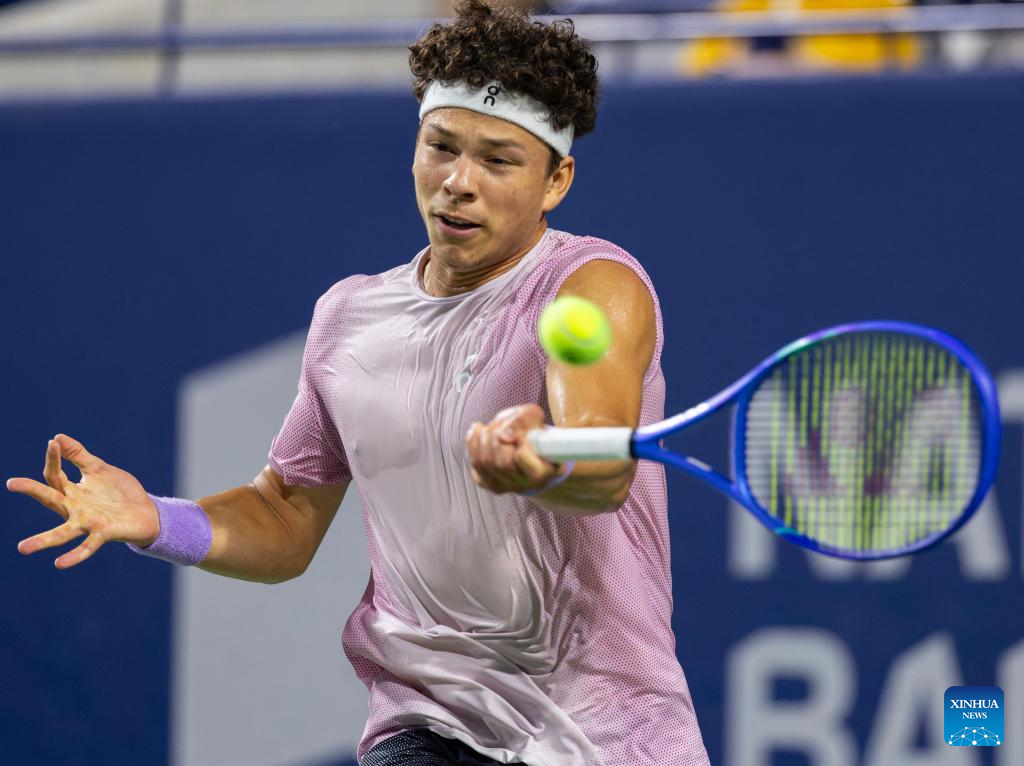 Ben Shelton of the United States returns the ball during the men's singles semifinal match between Ben Shelton of the United States and Taylor Fritz of the United States at the 2025 National Bank Open tennis tournament in Toronto, Canada, on Aug. 6, 2025. (Photo by Zou Zheng/Xinhua)