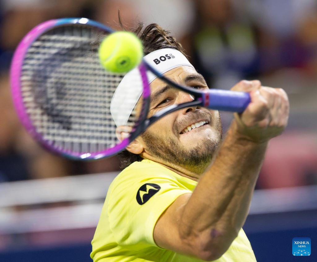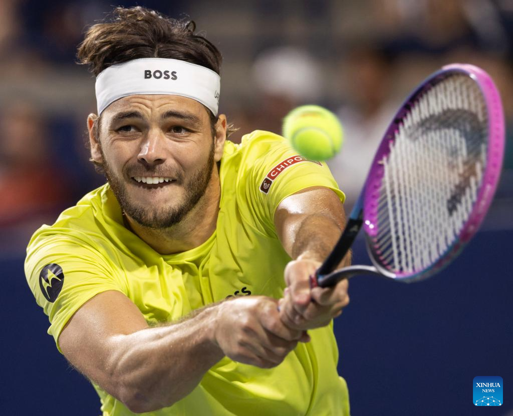 Taylor Fritz of the United States returns the ball during the men's singles semifinal match between Ben Shelton of the United States and Taylor Fritz of the United States at the 2025 National Bank Open tennis tournament in Toronto, Canada, on Aug. 6, 2025. (Photo by Zou Zheng/Xinhua)