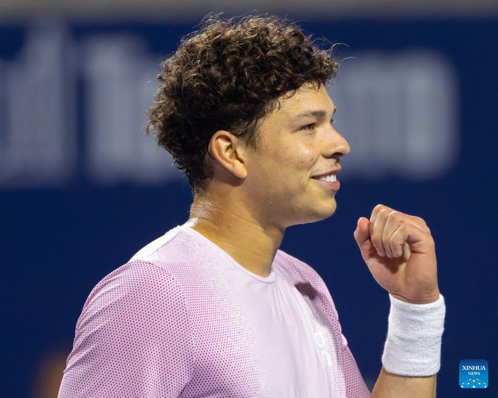 Ben Shelton of the United States celebrates scoring during the men's singles semifinal match between Ben Shelton of the United States and Taylor Fritz of the United States at the 2025 National Bank Open tennis tournament in Toronto, Canada, on Aug. 6, 2025. (Photo by Zou Zheng/Xinhua)