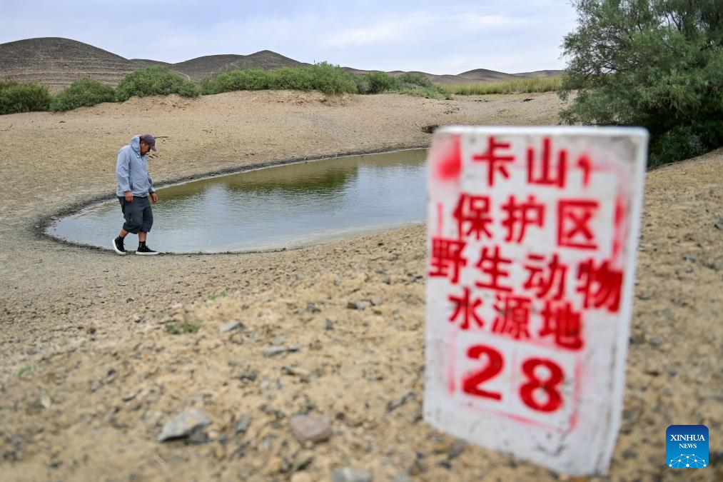 A staff member checks a water source at the Karamaile Mountain Nature Reserve, northwest China's Xinjiang Uygur Autonomous Region, July 28, 2025. (Xinhua/Ding Lei)