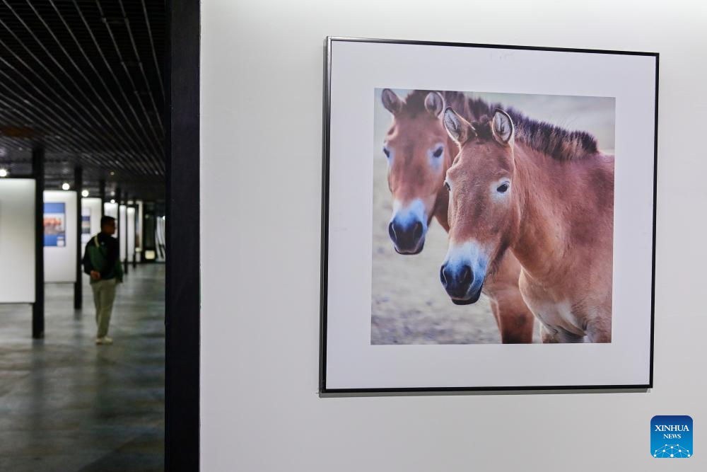 A man visits a photo exhibition during an event marking 40 years since Przewalski's horses' reintroduction to China in Urumqi, northwest China's Xinjiang Uygur Autonomous Region, Aug. 6, 2025. (Xinhua/Ding Lei)