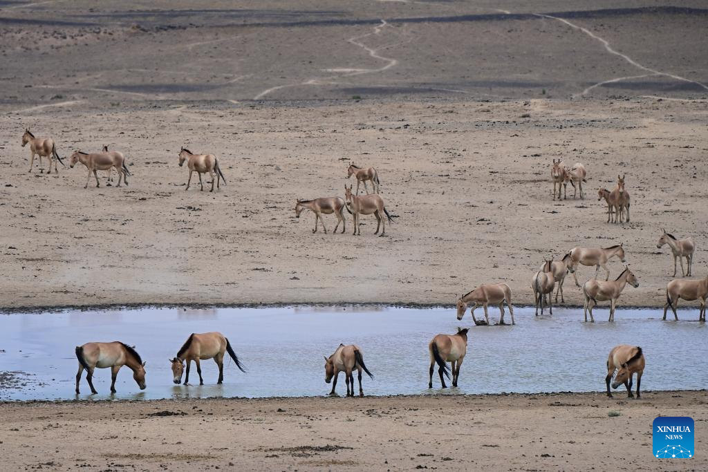 Przewalski's horses and other wild animals drink water at the Karamaile Mountain Nature Reserve, northwest China's Xinjiang Uygur Autonomous Region, July 28, 2025. (Xinhua/Ding Lei)