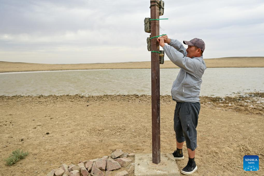 A staff member sets an infrared camera at a water source at the Karamaile Mountain Nature Reserve, northwest China's Xinjiang Uygur Autonomous Region, July 28, 2025. (Xinhua/Ding Lei)