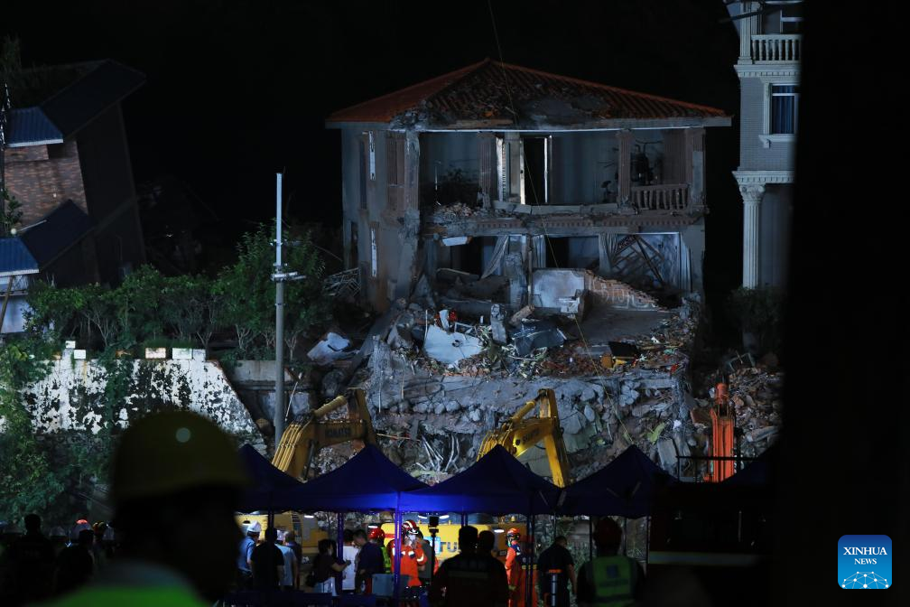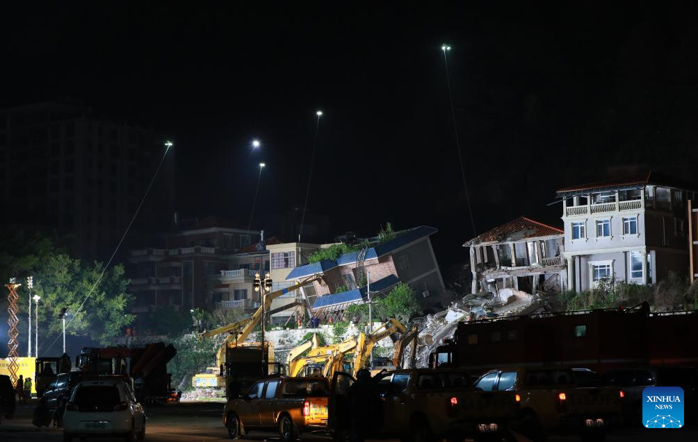 This photo taken on Aug. 6, 2025 shows a scene at the rescue site of a rain-triggered landslide at Dayuan Village, Baiyun District of Guangzhou, south China's Guangdong Province. As of 9 a.m. Thursday, rescuers have brought out nine people from debris, with two of them confirmed dead, after a rain-triggered landslide trapped 14 people in Guangzhou, capital of south China's Guangdong Province, on Wednesday morning, local authorities said.