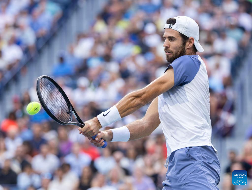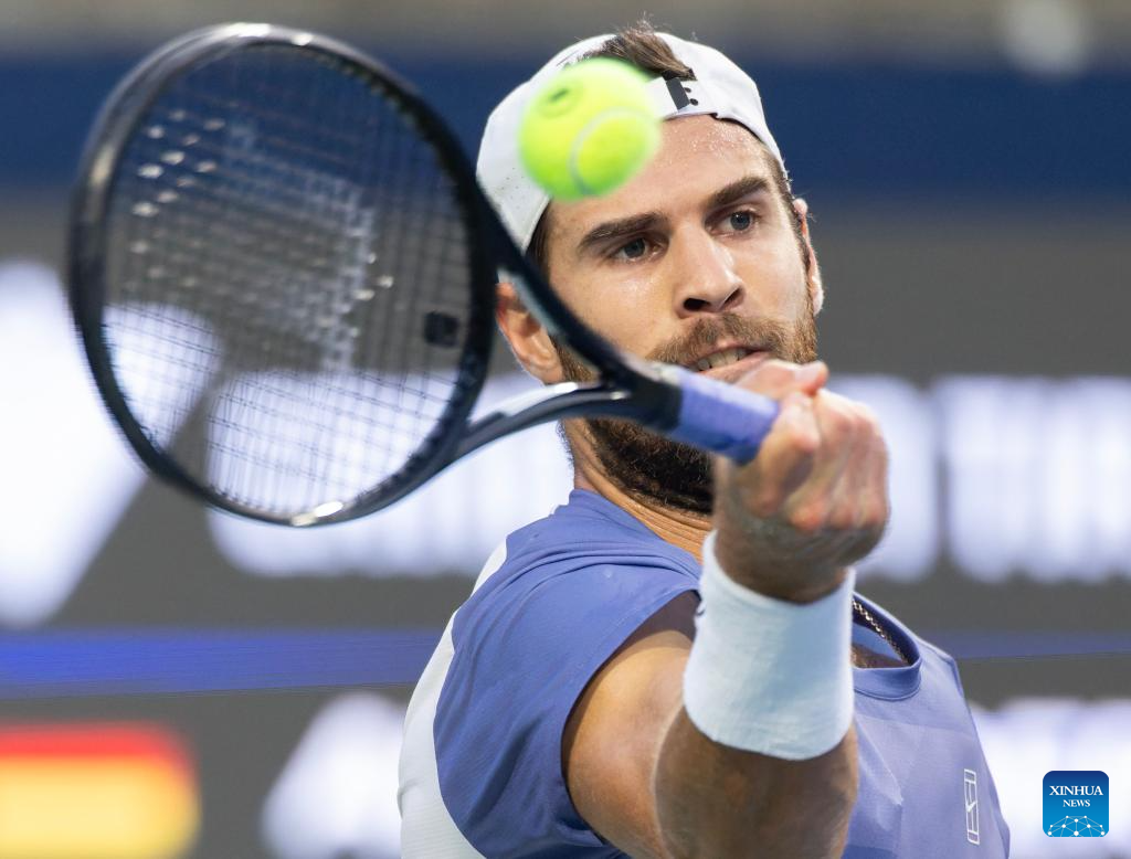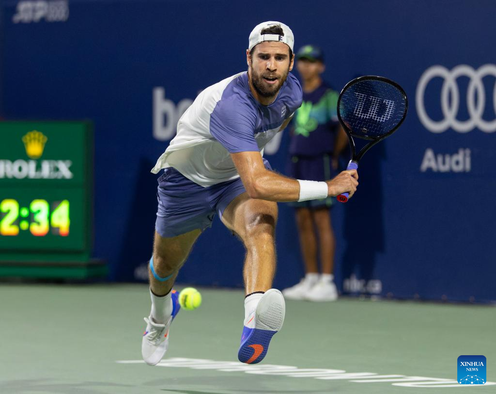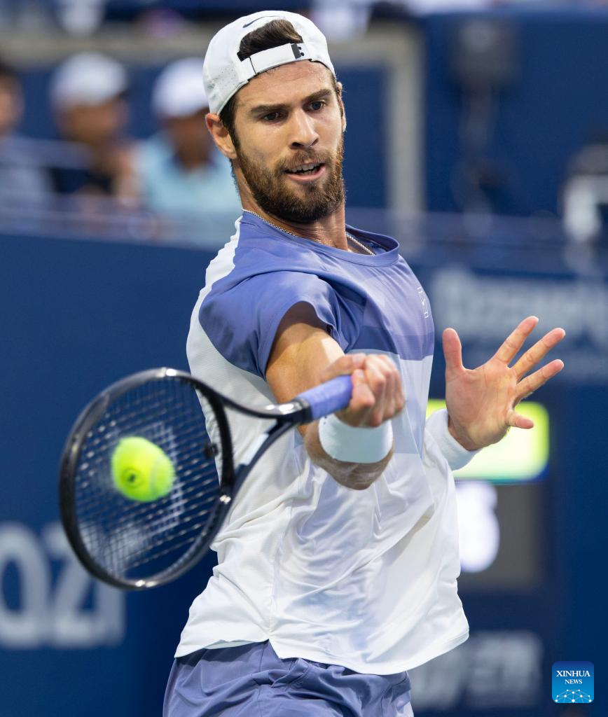 Karen Khachanov of Russia returns the ball during the men's singles semifinal match between Alexander Zverev of Germany and Karen Khachanov of Russia at the 2025 National Bank Open tennis tournament in Toronto, Canada, on Aug. 6, 2025. (Photo by Zou Zheng/Xinhua)