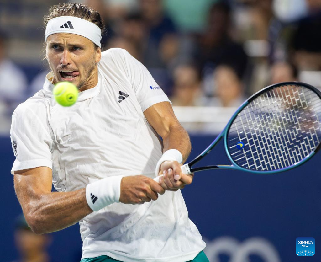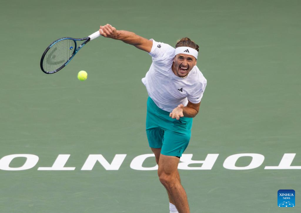 Alexander Zverev of Germany returns the ball during the men's singles semifinal match between Alexander Zverev of Germany and Karen Khachanov of Russia at the 2025 National Bank Open tennis tournament in Toronto, Canada, on Aug. 6, 2025. (Photo by Zou Zheng/Xinhua)