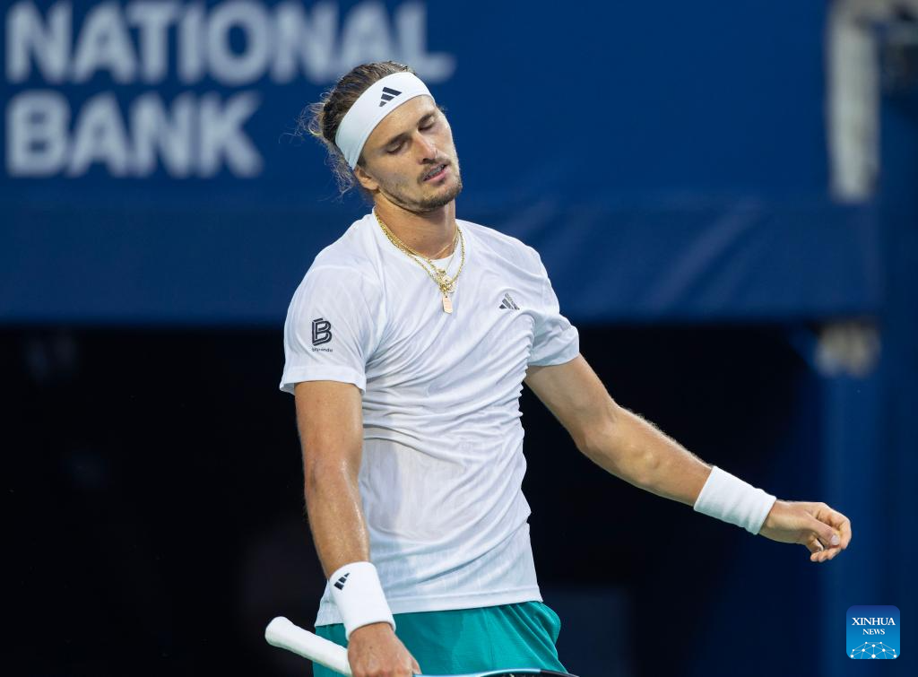 Alexander Zverev of Germany reacts during the men's singles semifinal match between Alexander Zverev of Germany and Karen Khachanov of Russia at the 2025 National Bank Open tennis tournament in Toronto, Canada, on Aug. 6, 2025. (Photo by Zou Zheng/Xinhua)