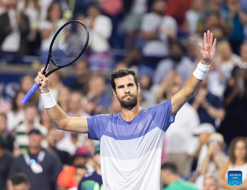 Karen Khachanov of Russia celebrates victory after the men's singles semifinal match between Alexander Zverev of Germany and Karen Khachanov of Russia at the 2025 National Bank Open tennis tournament in Toronto, Canada, on Aug. 6, 2025. (Photo by Zou Zheng/Xinhua)