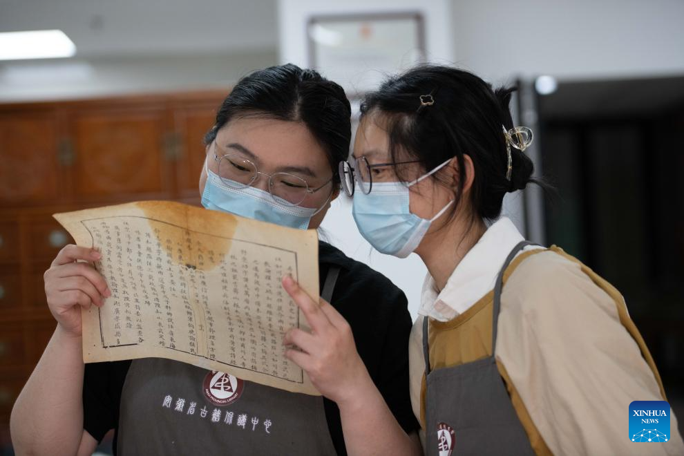 Book restorers Jiang Yun (L) and Zhang Wenwen discuss during restoration work at Anhui Provincial Library in Hefei, east China's Anhui Province, May 8, 2025. (Xinhua/Zhang Duan)