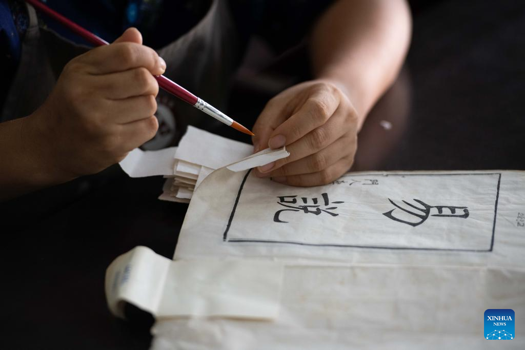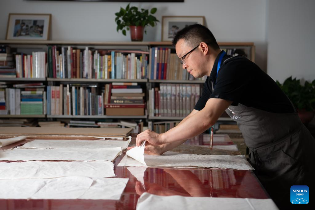 Book restorer Zhou Yahan demonstrates restoration techniques at Anhui Provincial Library in Hefei, east China's Anhui Province, June 4, 2025. (Xinhua/Zhang Duan)