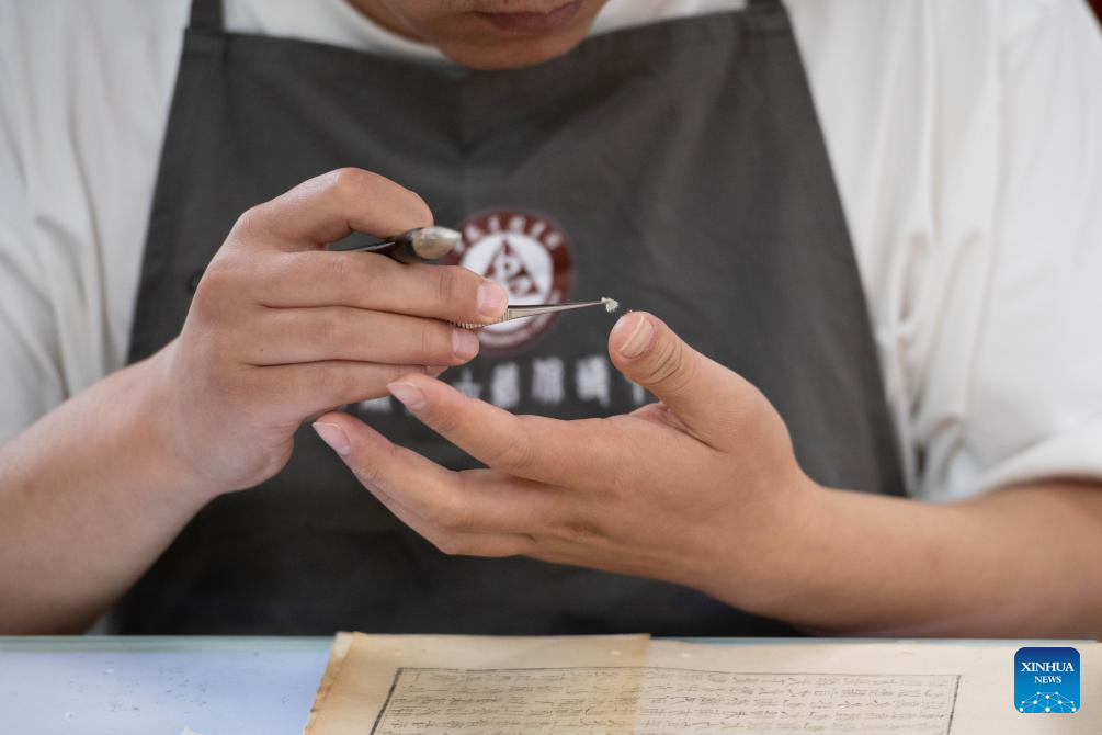 Book restorer Jin Xin restores a book at Anhui Provincial Library in Hefei, east China's Anhui Province, June 24, 2025. (Xinhua/Zhang Duan)