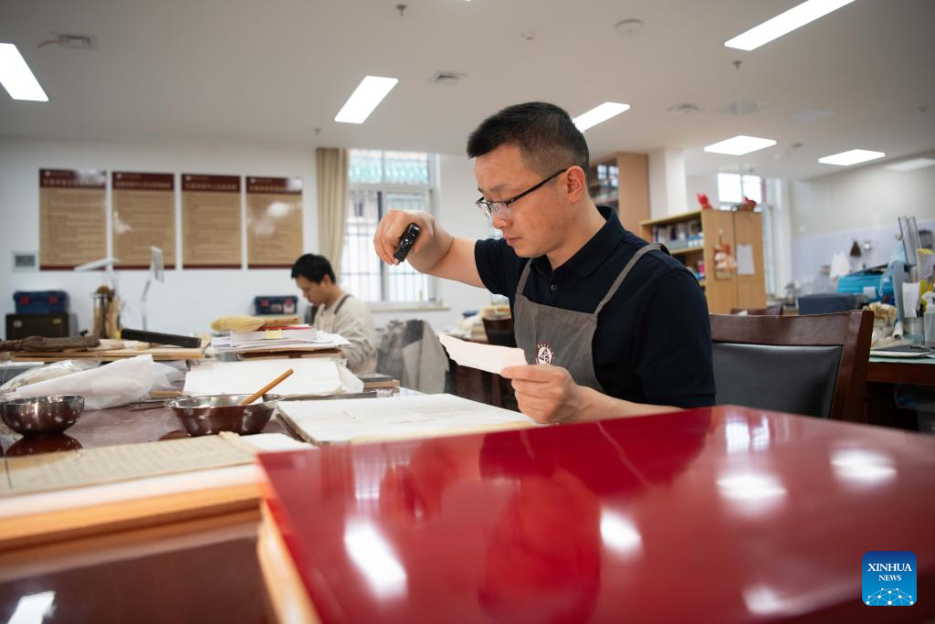 Book restorer Geng Ning checks a page under restoration at Anhui Provincial Library in Hefei, east China's Anhui Province, June 17, 2025. (Xinhua/Zhang Duan)