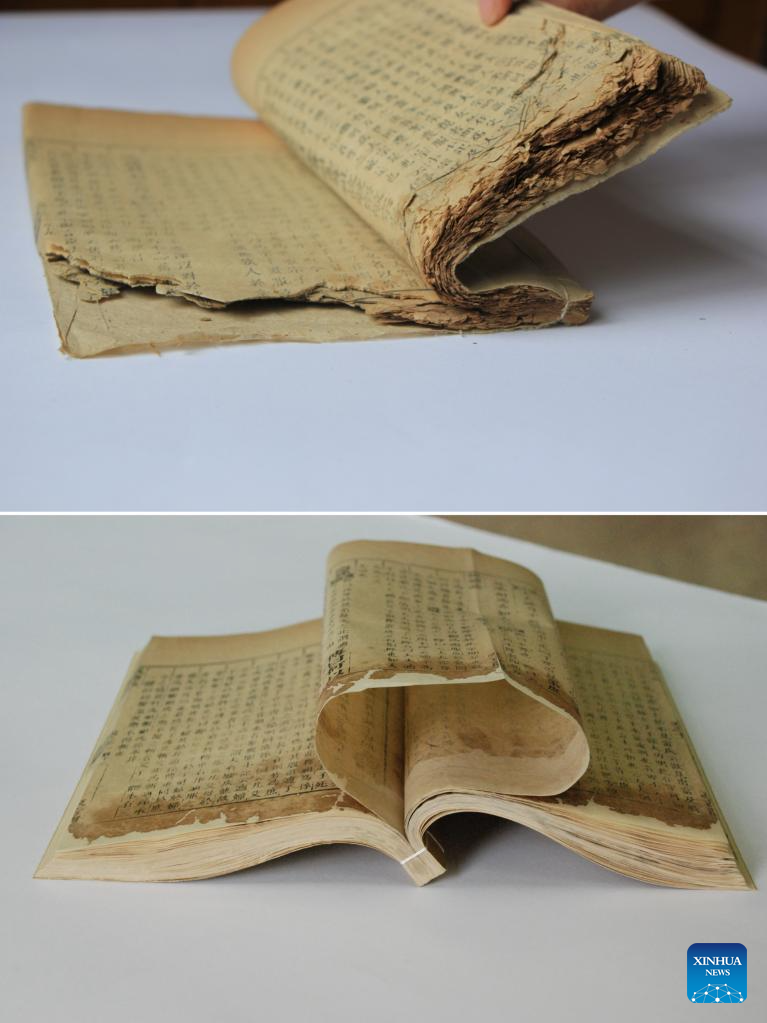 This undated combo photo shows an ancient book before restoration (above) and after restoration (below) at Anhui Provincial Library in Hefei, east China's Anhui Province. (Xinhua/Zhang Duan)