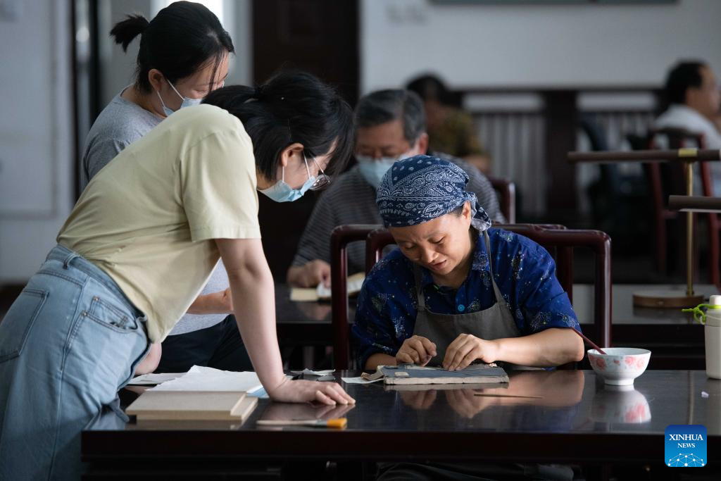 Book restorer Zhou Yahan (front, R) demonstrates restoration techniques at Anhui Provincial Library in Hefei, east China's Anhui Province, June 4, 2025. (Xinhua/Zhang Duan)
