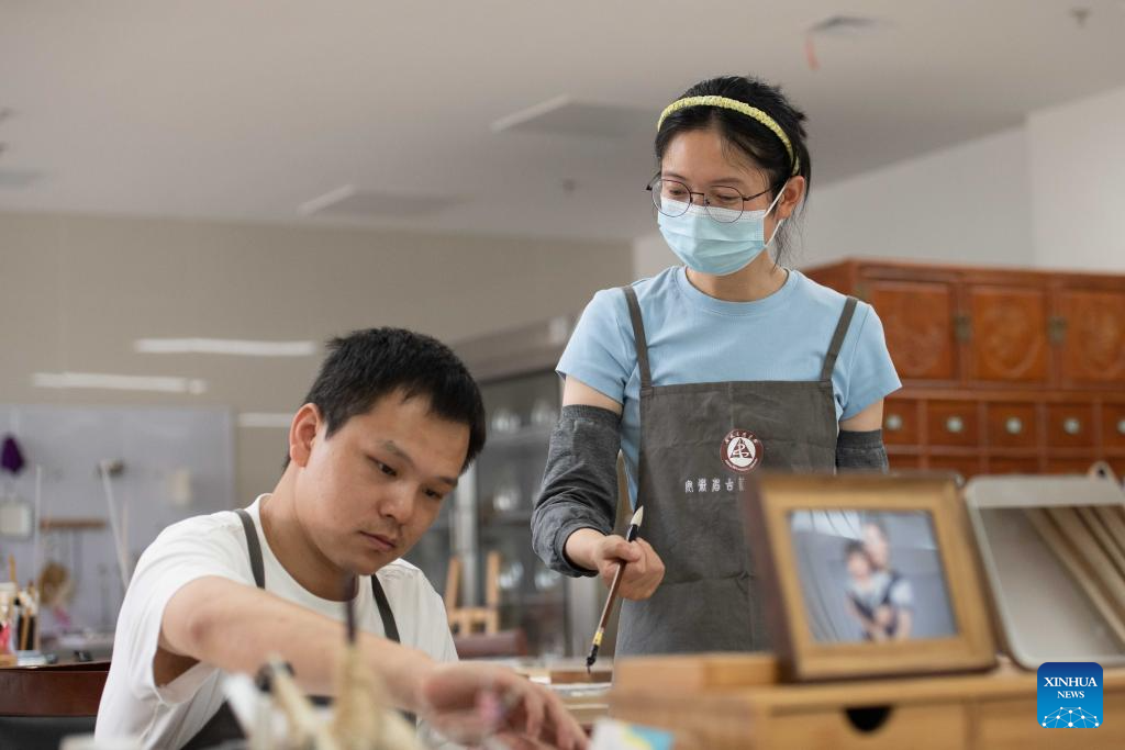 Book restorer Zang Chunhua (front) restores a book at Anhui Provincial Library in Hefei, east China's Anhui Province, May 8, 2025. (Xinhua/Zhang Duan)