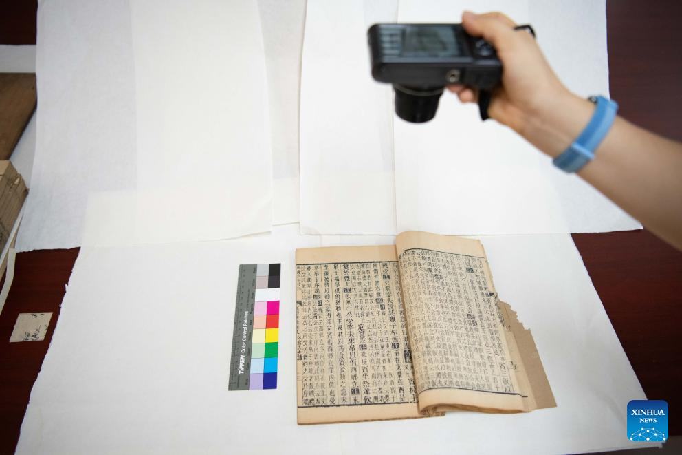 Book restorer Zhou Yahan takes a photo of an ancient book before restoring it at Anhui Provincial Library in Hefei, east China's Anhui Province, Aug. 5, 2025. (Xinhua/Zhang Duan)