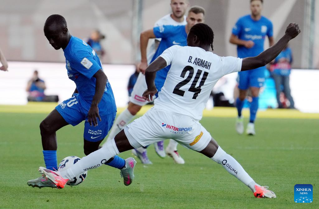 Mor Talla (L) of RFS vies with Bob Nii Armah of KuPS Kuopio during the UEFA Europa League qualifiers third round football match between RFS of Latvia and KuPS Kuopio of Finland in Riga, Latvia, Aug. 6, 2025. (Photo by Edijs Palens/Xinhua)