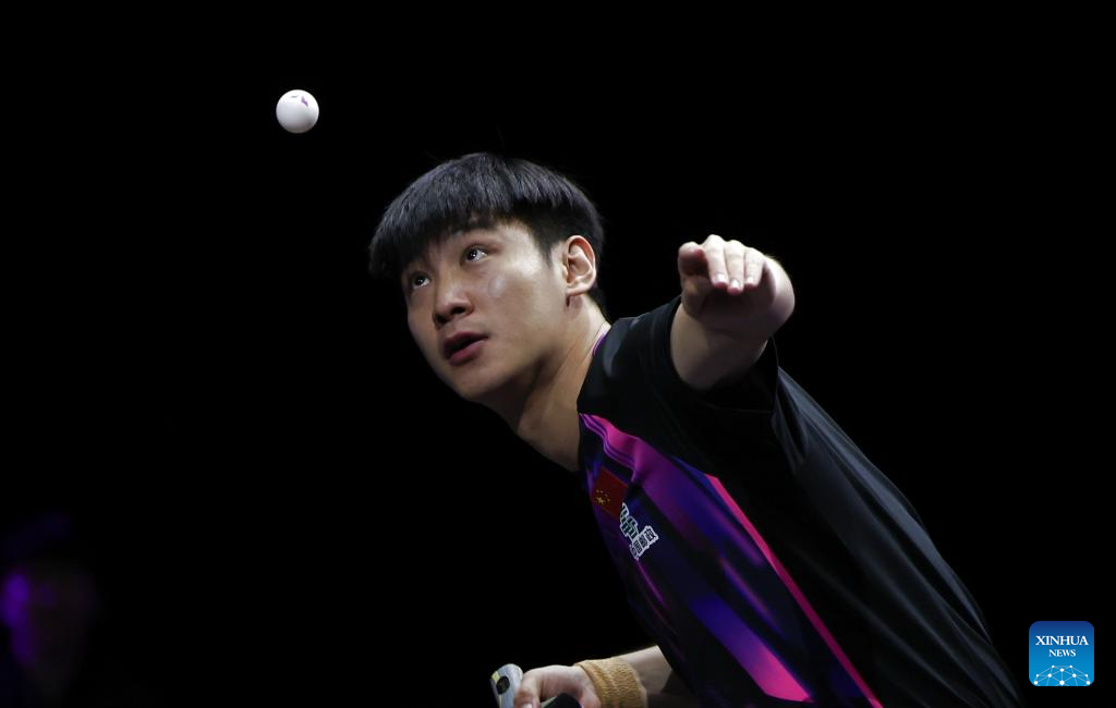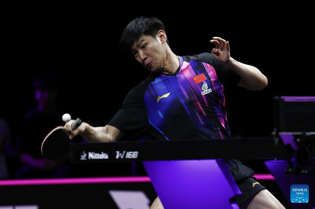 Xue Fei of China returns the ball during the men's singles round of 32 match between Xue Fei of China and Anton Kallberg of Sweden at the WTT Champions Yokohama 2025 in Yokohama, Japan, Aug. 7, 2025. (Xinhua/Yue Chenxing)